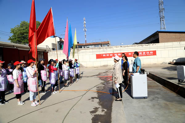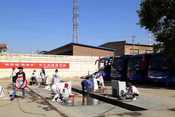 汽車公司現(xiàn)有職工年齡結(jié)構(gòu)偏大,并且多為男性,唯一的一名女工,擔負著多項工作,在清洗班車座套這項工作上存在困難,一方有困難,八方來援手,集團女工委員會得知具體情況后,聯(lián)合汽車工會發(fā)起倡議,并得到各單位女工主任的積極響應。經(jīng)過縝密的準備工作,18日9點,汽車公司辦公樓前,洗衣盆、洗衣機、晾衣繩、晾衣架整齊有序的分組擺放,30多名女工提前處理完本職工作齊聚賽場。張雪梅主席發(fā)表講話,鼓勵和表揚參加活動的女工有愛心、有活力,展示了女工陽光向上的一面。汽車公司工會主席張亞軍宣布清洗工作以分組的方式進行,宣布規(guī)則后,大家立刻熱火朝天的投入比賽之中。至下午14點,賽活動共清洗座套240套,窗簾100副,院子里如彩旗飄揚,展示著大家勞動的成績。