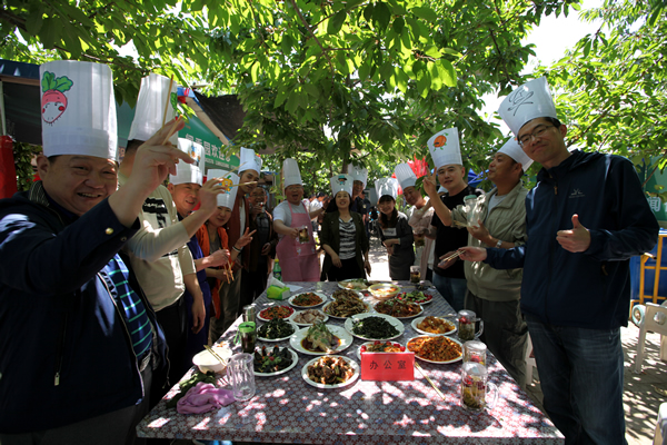 他們或者三兩成團(tuán)張羅,或者獨(dú)自穿行忙碌,配菜的配菜,炒菜的炒菜,擺放的排放……花香、菜香,歡笑聲、音樂聲交織在一起,使大家忘記了年齡,忘記了煩惱,忘記了疲勞。其中有90后員工此生第一次炒出來的土豆絲,也有煎、炒、烹、炸廚藝行云流水般的展現(xiàn)。一盤盤色彩繽紛,造型別致的菜品陸續(xù)擺放上桌,有醬香誘人的全肘,創(chuàng)意可佳的菠蘿燉排骨,有大顯刀工的三絲和青豆抱蝦仁,也有民族風(fēng)味地道的黃燜羊肉,干鍋土豆片……。