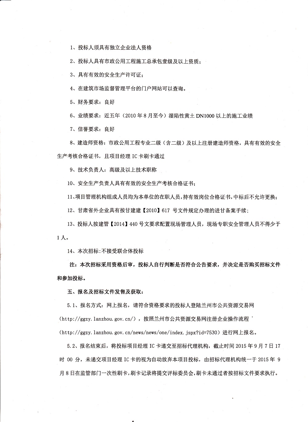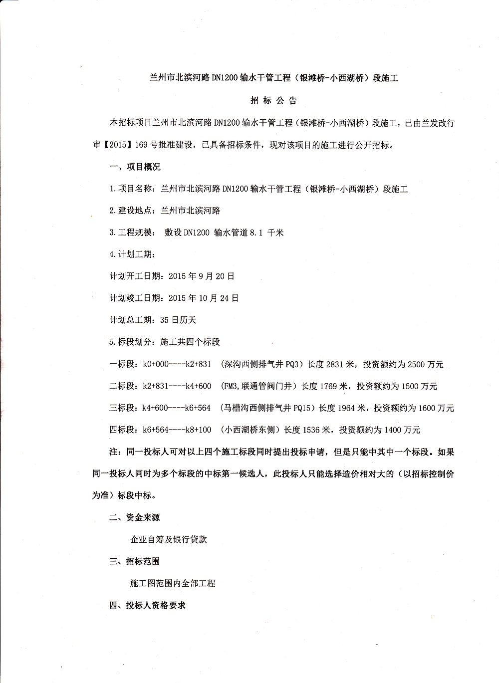 蘭州市北濱河路DN1200輸水干管工程(銀灘橋-小西湖橋)段施工招標(biāo)公告