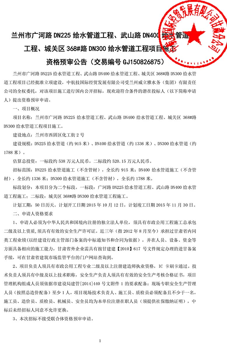 蘭州市廣河路DN225給水管道工程、武山路DN400給水管道工程、城關(guān)區(qū)368#路DN300給水管道工程項目材料采購招標(biāo)公告